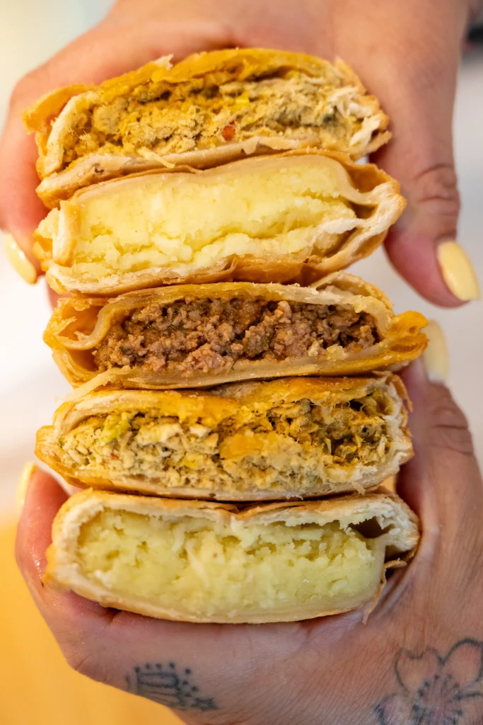Crujientes por fuera, rellenas de puro sabor venezolano por dentro. ¡De carne mechada, pollo, queso, pabellón y carne molida… la que te grite el corazón!